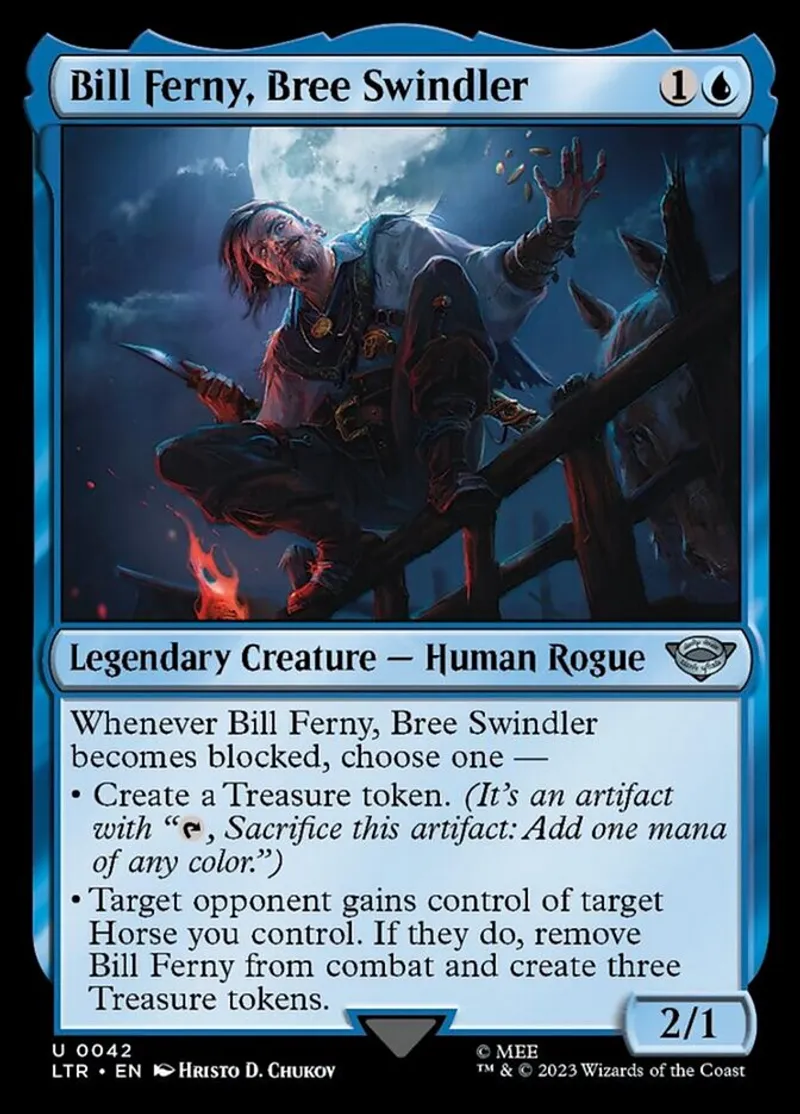 • Target opponent gains control of target Horse you control. If they do, remove Bill Ferny from combat and create three Treasure tokens. | ||