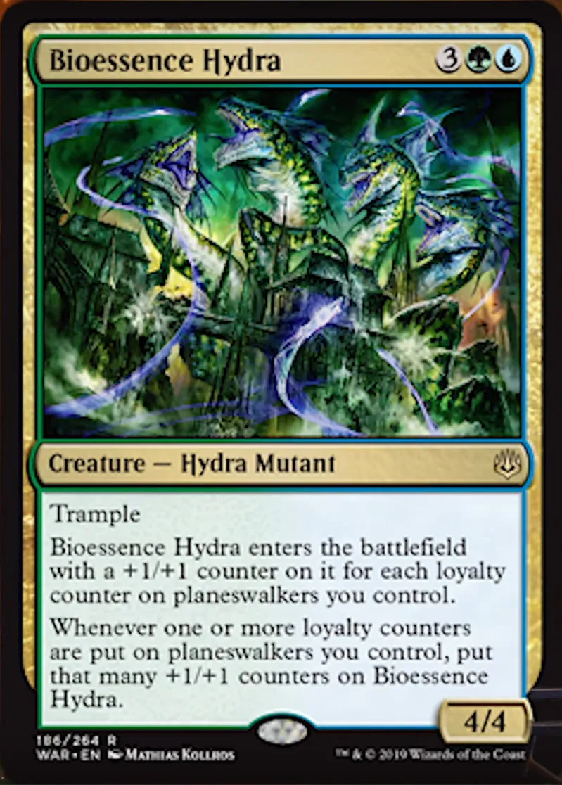 Whenever one or more loyalty counters are put on planeswalkers you control, put that many +1/+1 counters on Bioessence Hydra. | ||