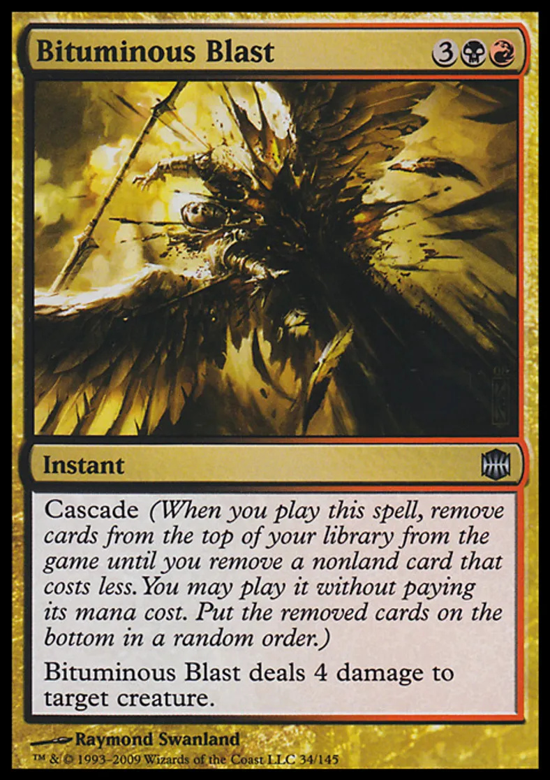 | Oracle Text | Cascade (When you cast this spell, exile cards from the top of your library until you exile a nonland card that costs less. You may cast it without paying its mana cost. Put the exiled cards on the bottom in a random order.) Bituminous Blast deals 4 damage to target creature. | ||