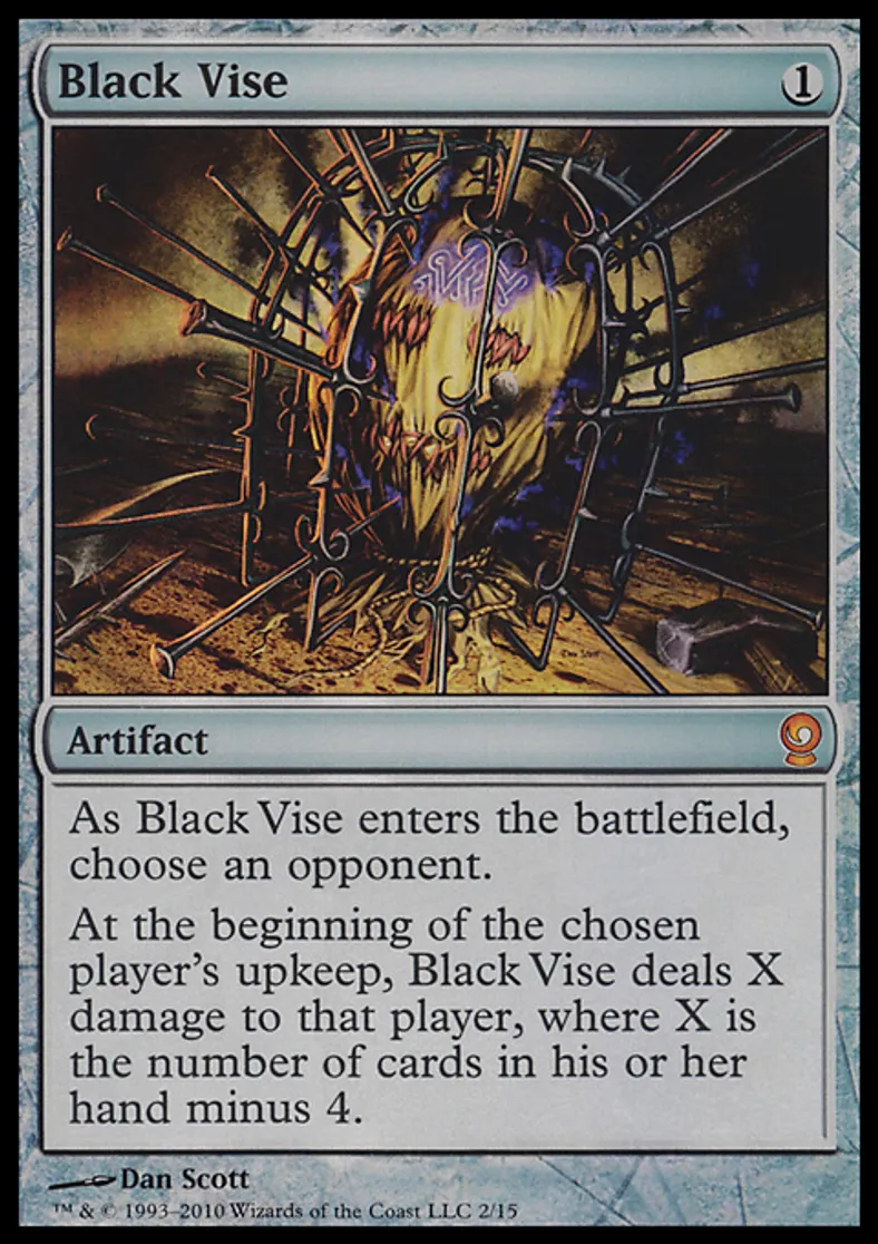 | Oracle Text | As Black Vise enters the battlefield, choose an opponent. At the beginning of the chosen player's upkeep, Black Vise deals X damage to that player, where X is the number of cards in his or her hand minus 4. | ||