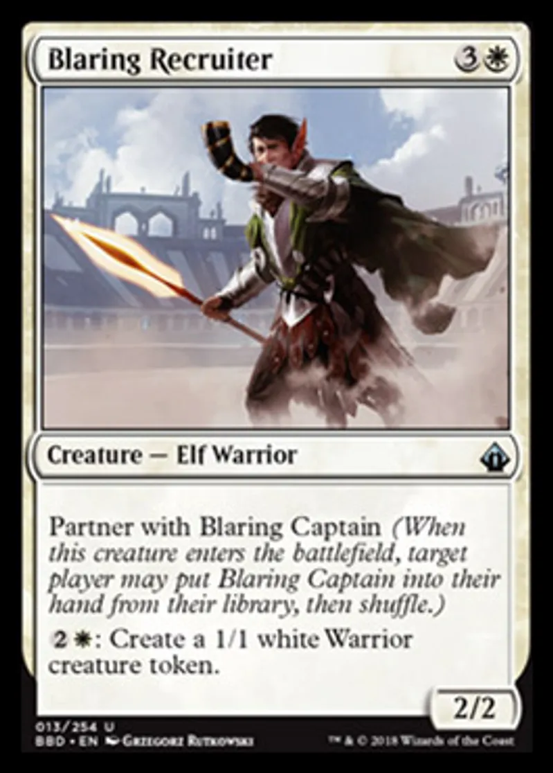 | Oracle Text | Partner with Blaring Captain (When this creature enters the battlefield, target player may put Blaring Captain into their hand from their library, then shuffle.) {{2}}{{w}}: Create a 1/1 white Warrior creature token. | ||