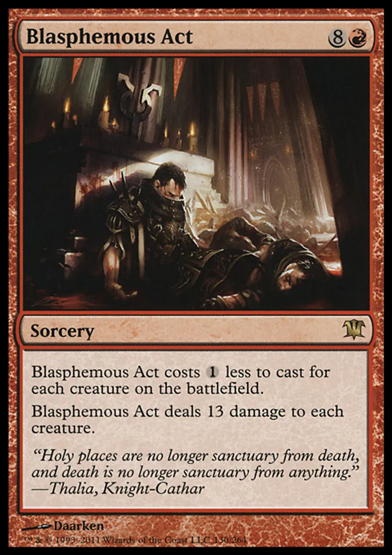 | Oracle Text | Blasphemous Act costs {{1}} less to cast for each creature on the battlefield. Blasphemous Act deals 13 damage to each creature. | ||