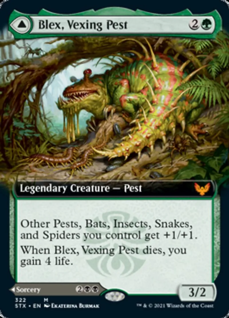 Blex, Vexing Pest (Extended Art) is a Mythic Rare in the set Strixhaven: School of Mages.
