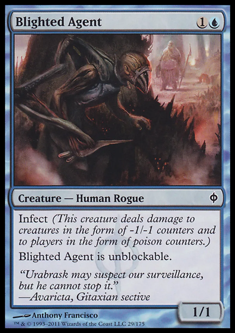 | Oracle Text | Infect (This creature deals damage to creatures in the form of -1/-1 counters and to players in the form of poison counters.) Blighted Agent is unblockable. | ||