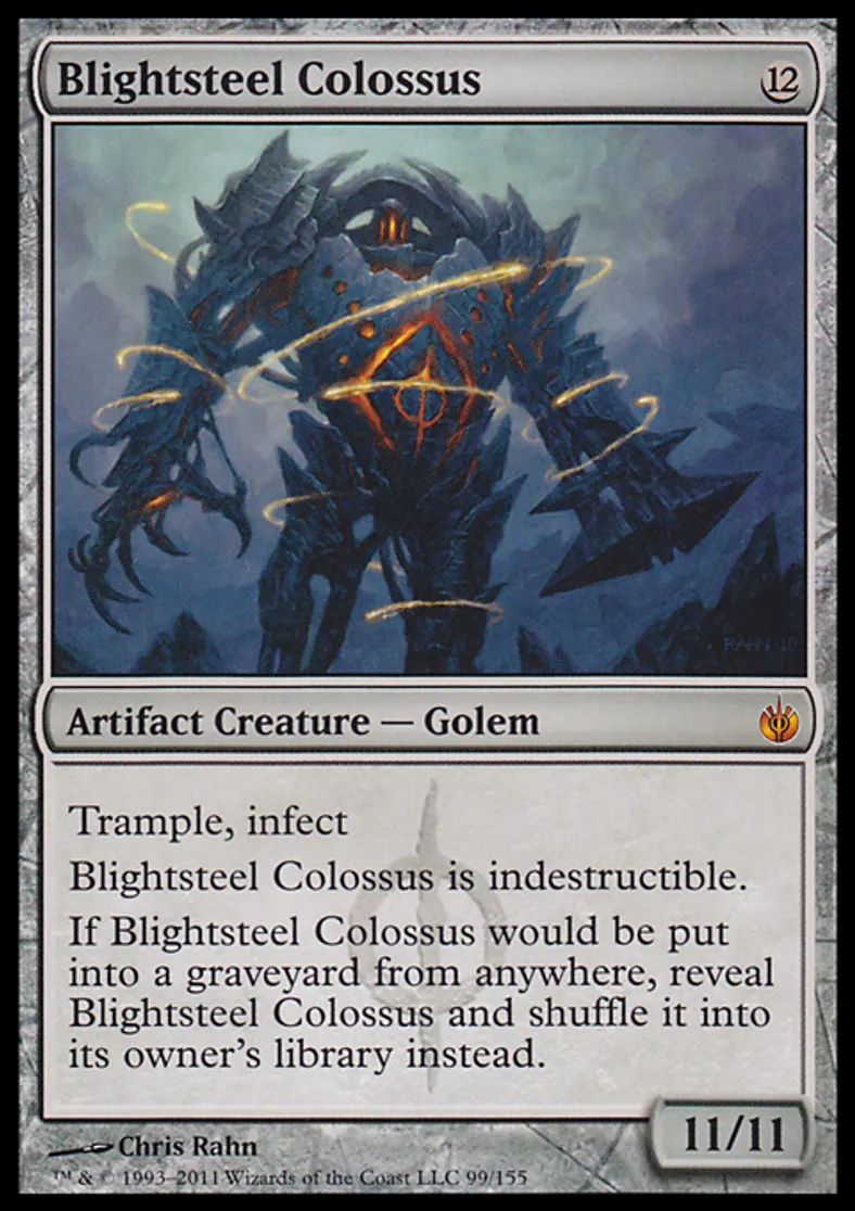 | Oracle Text | Trample, infect Blightsteel Colossus is indestructible. If Blightsteel Colossus would be put into a graveyard from anywhere, reveal Blightsteel Colossus and shuffle it into its owner's library instead. | ||