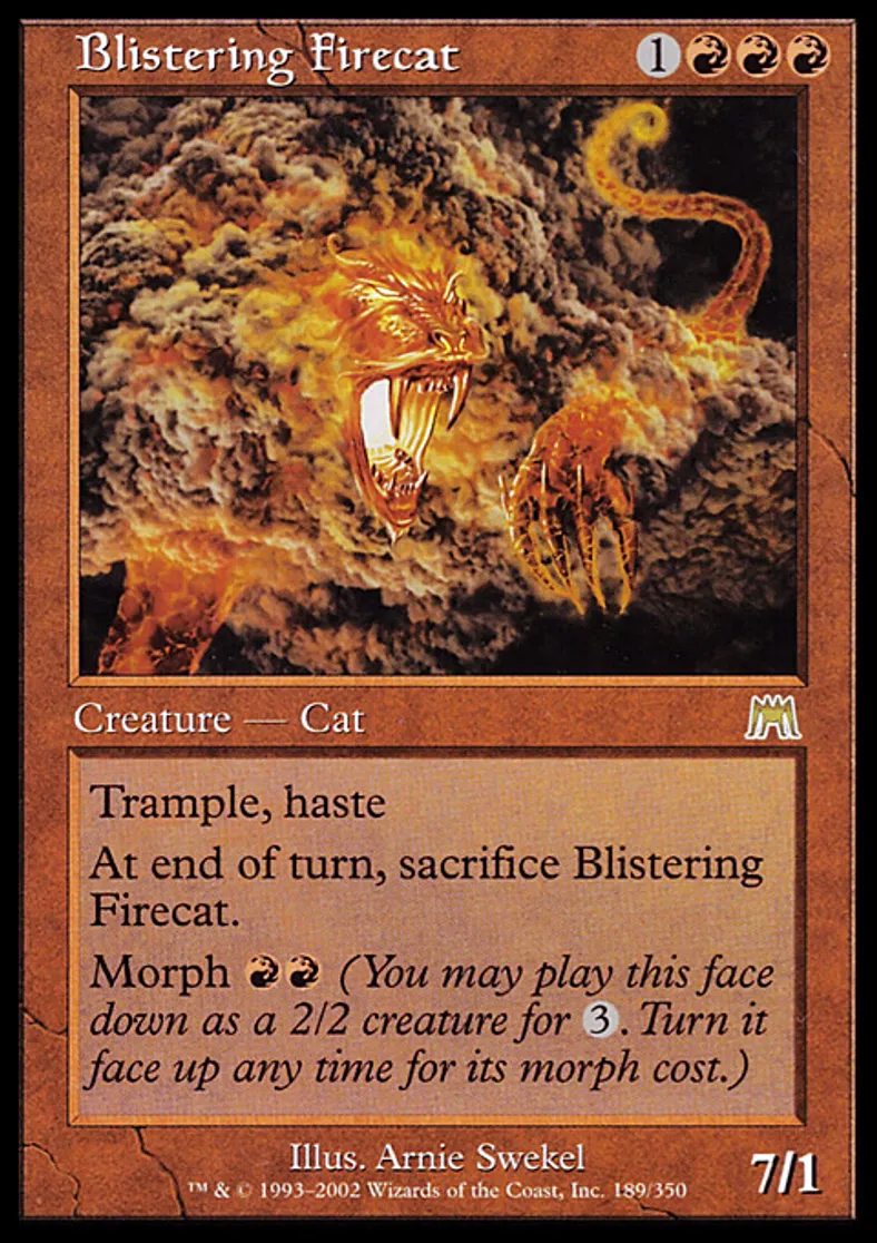 | Oracle Text | Trample, haste At the beginning of the end step, sacrifice Blistering Firecat. Morph {{r}}{{r}} (You may cast this face down as a 2/2 creature for {{3}}. Turn it face up any time for its morph cost.) | ||