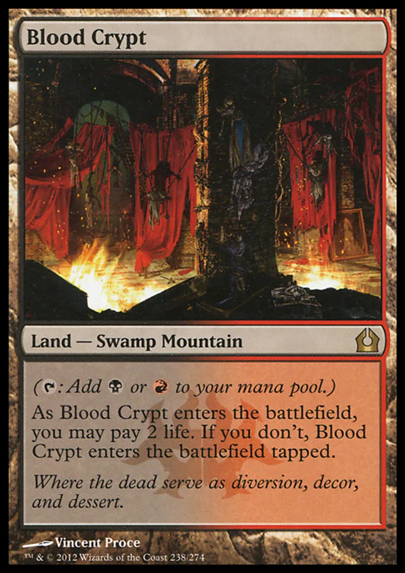 | Oracle Text | ({{t}}: Add {{b}} or {{r}} to your mana pool.) As Blood Crypt enters the battlefield, you may pay 2 life. If you don't, Blood Crypt enters the battlefield tapped. | ||