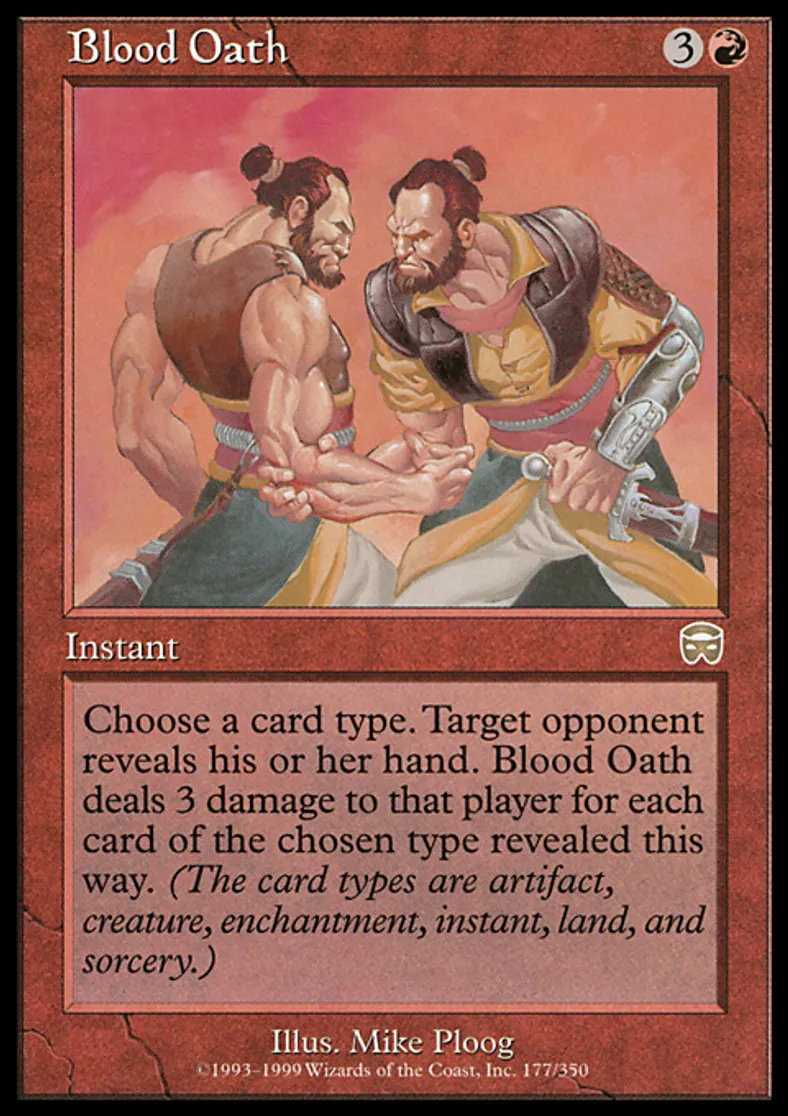 | Oracle Text | Choose a card type. Target opponent reveals his or her hand. Blood Oath deals 3 damage to that player for each card of the chosen type revealed this way. (Artifact, creature, enchantment, instant, land, planeswalker, sorcery, and tribal are card types.) | ||
