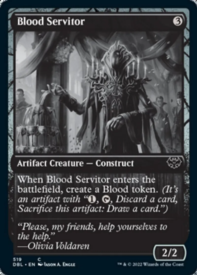 | Oracle Text | When Blood Servitor enters the battlefield, create a Blood token. (It's an artifact with "{1}, {T}, Discard a card, Sacrifice this artifact: Draw a card.") | ||