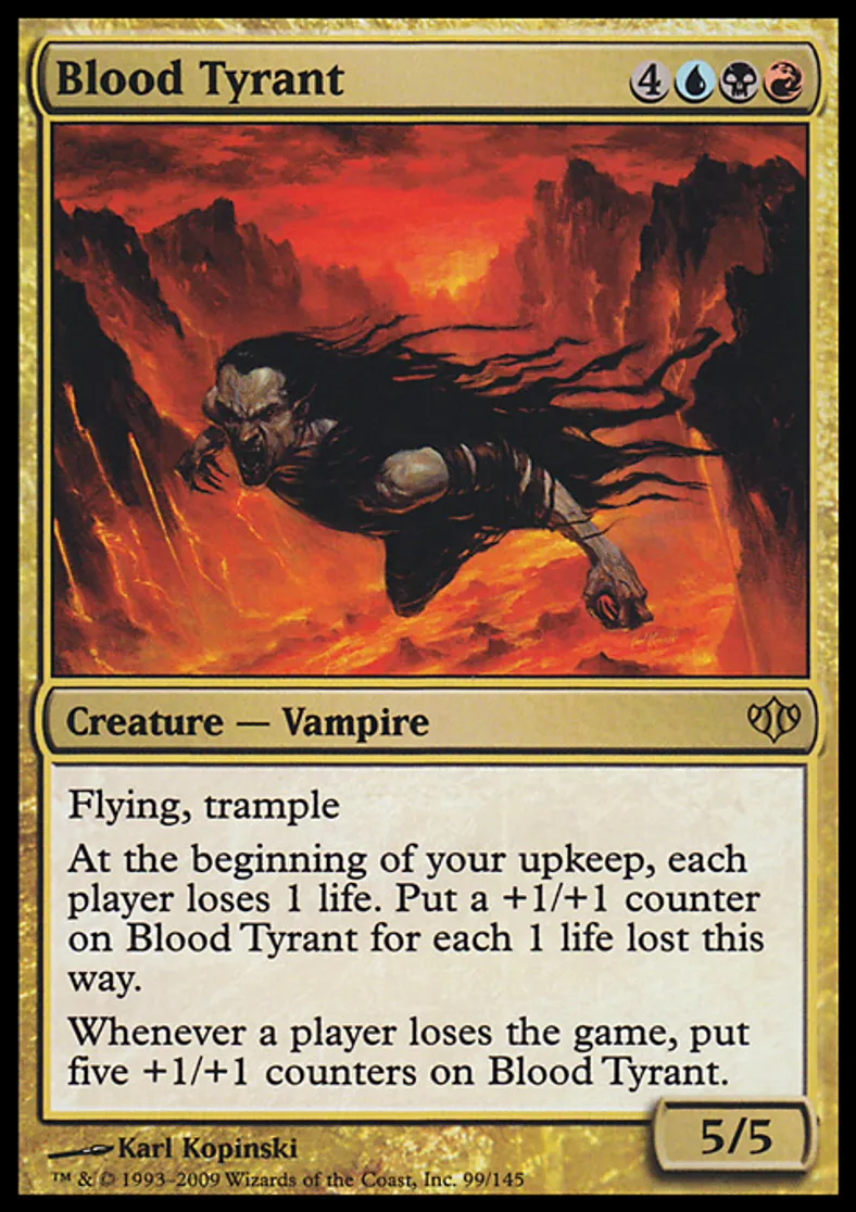 | Oracle Text | Flying, trample At the beginning of your upkeep, each player loses 1 life. Put a +1/+1 counter on Blood Tyrant for each 1 life lost this way. Whenever a player loses the game, put five +1/+1 counters on Blood Tyrant. | ||