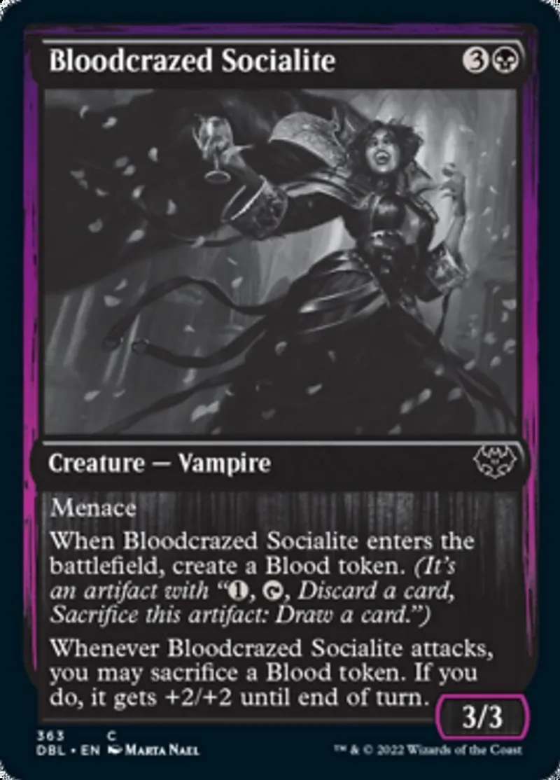 Whenever Bloodcrazed Socialite attacks, you may sacrifice a Blood token. If you do, it gets +2/+2 until end of turn. | ||