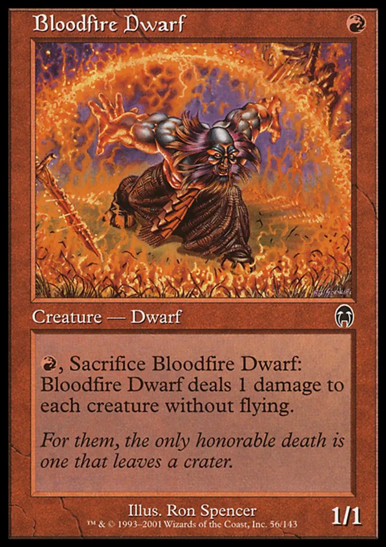 | Oracle Text | {{r}}, Sacrifice Bloodfire Dwarf: Bloodfire Dwarf deals 1 damage to each creature without flying. | ||