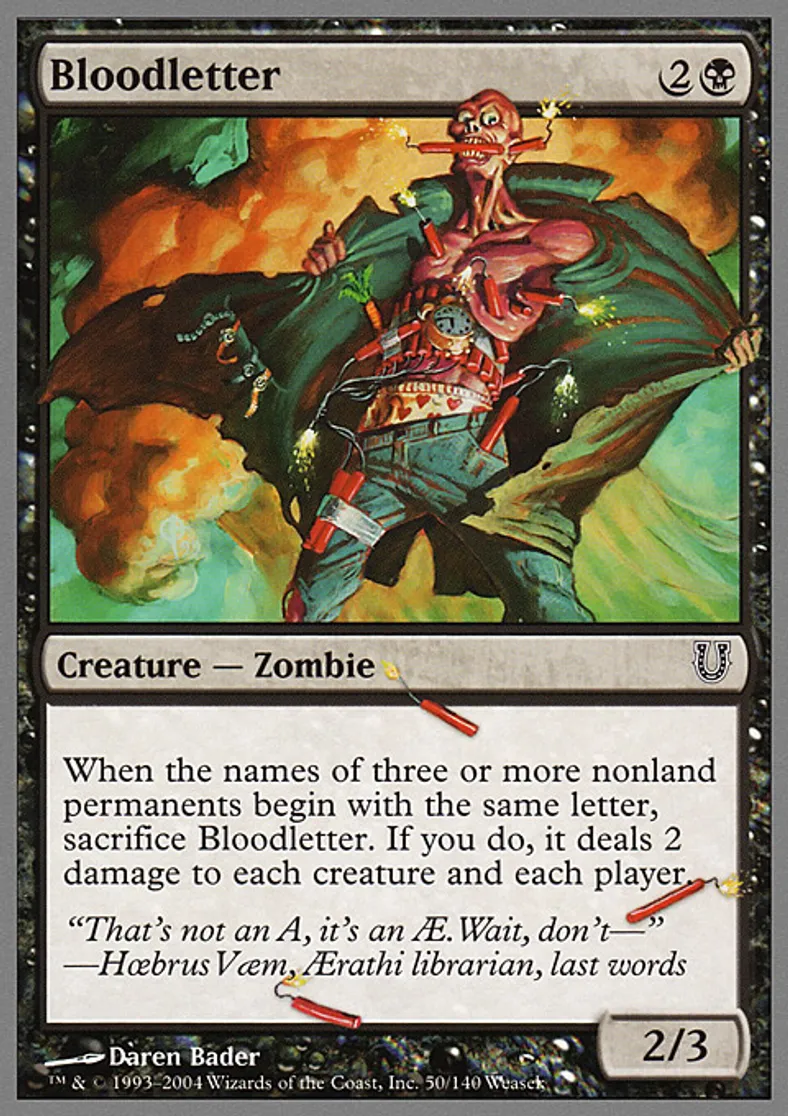 | Oracle Text | When the names of three or more nonland permanents begin with the same letter, sacrifice Bloodletter. If you do, it deals 2 damage to each creature and each player. | ||
