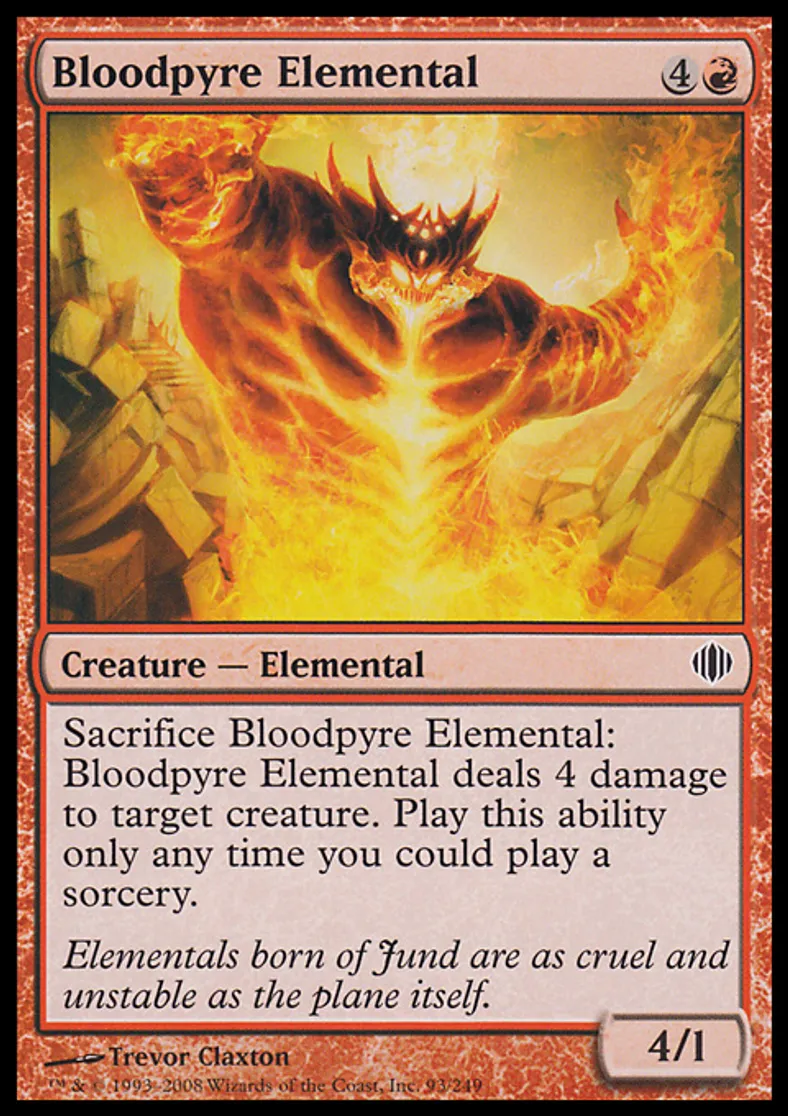 | Oracle Text | Sacrifice Bloodpyre Elemental: Bloodpyre Elemental deals 4 damage to target creature. Activate this ability only any time you could cast a sorcery. | ||