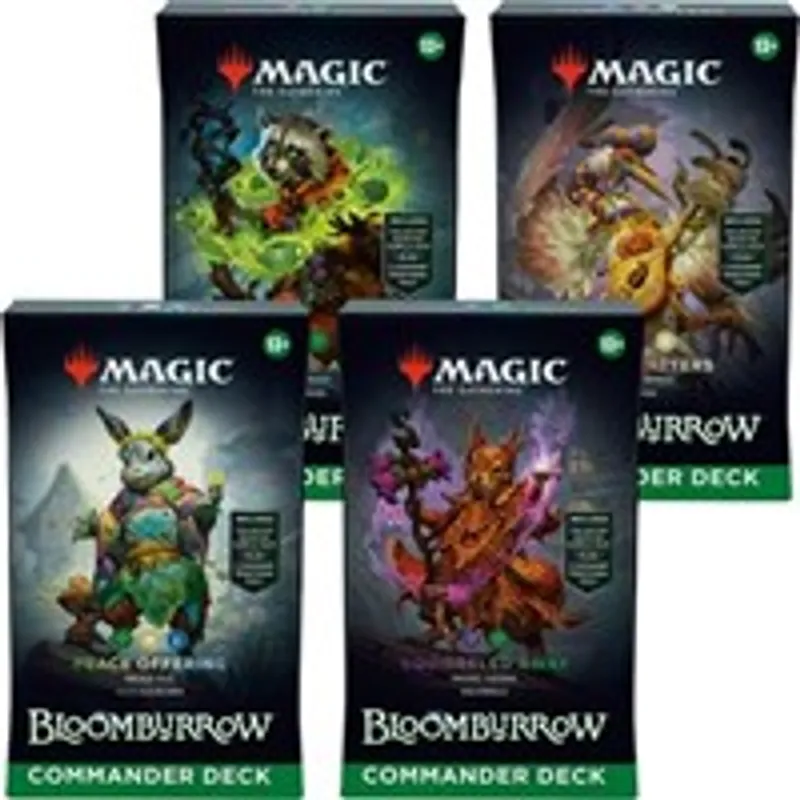 | Flavor Text | In Bloomburrow™, the Valley is threatened by elemental forces raging out of control, and salvation falls on the shoulders of its smallest protectors. Players will put their best paws forward, fighting alongside mice, frogs, bats, birds, and myriad other critters to restore the balance of peace—and prove bravery comes in all sizes. <br> In Commander, four players come together to show their strength and strategy, with one player coming out on top. Each 100-card ready-to-play Bloomburrow™ Commander Deck makes it easy for Commander fans in your store to grab a deck and play right away. <br> Contents: <br> • 1 each of the 4 Bloomburrow Commander Decks | ||