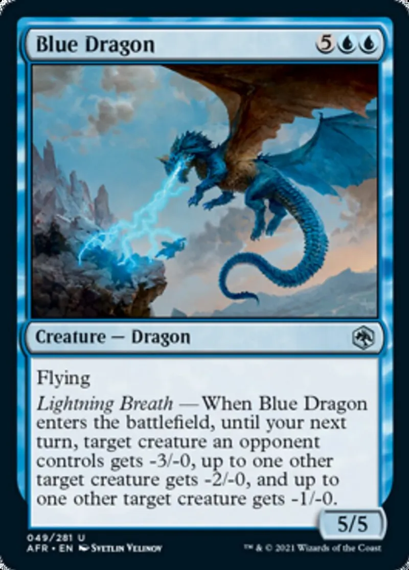 Lightning Breath — When Blue Dragon enters the battlefield, until your next turn, target creature an opponent controls gets -3/-0, up to one other target creature gets -2/-0, and up to one other target creature gets -1/-0. | ||