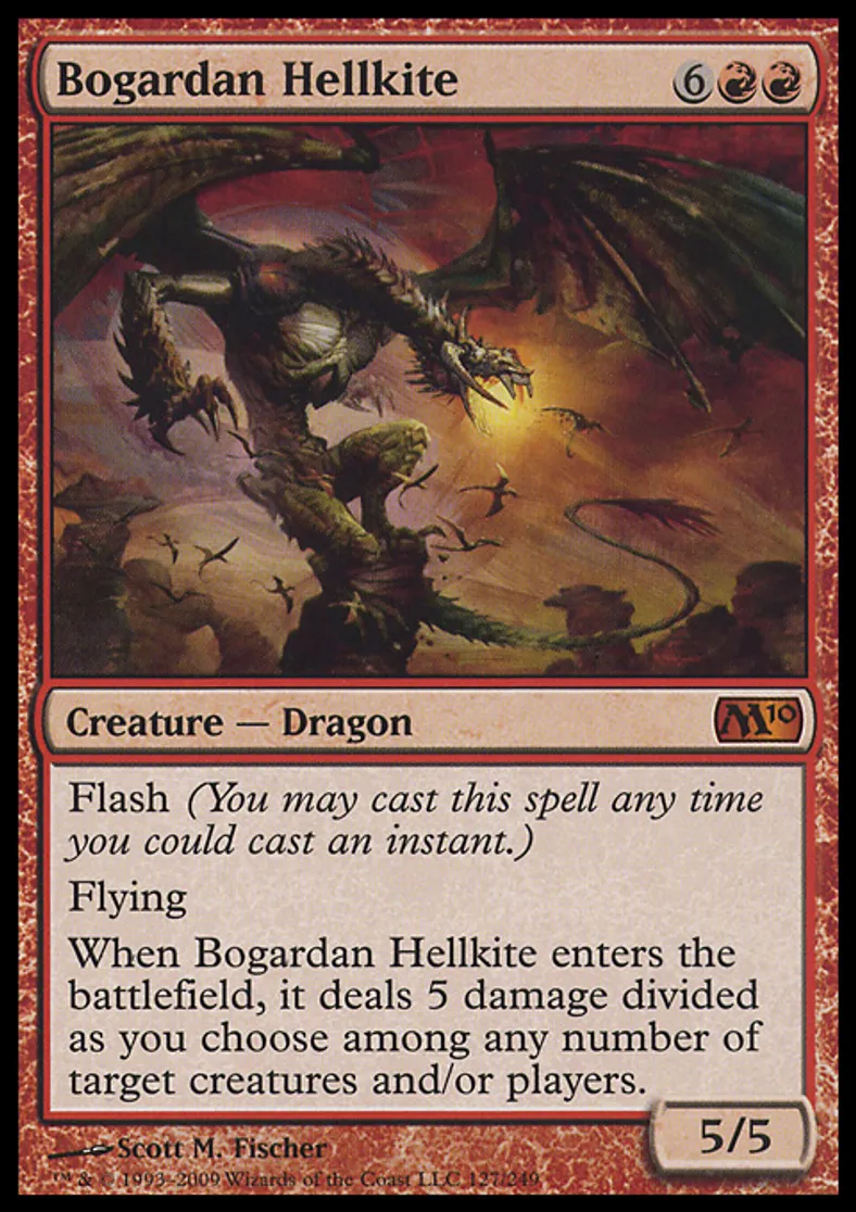 | Oracle Text | Flash (You may cast this spell any time you could cast an instant.) Flying When Bogardan Hellkite enters the battlefield, it deals 5 damage divided as you choose among any number of target creatures and/or players. | ||
