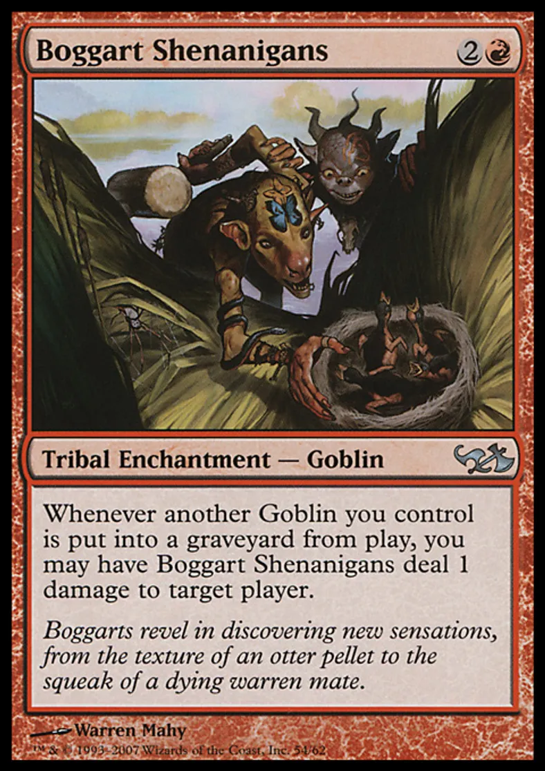 | Oracle Text | Whenever another Goblin you control dies, you may have Boggart Shenanigans deal 1 damage to target player. | ||