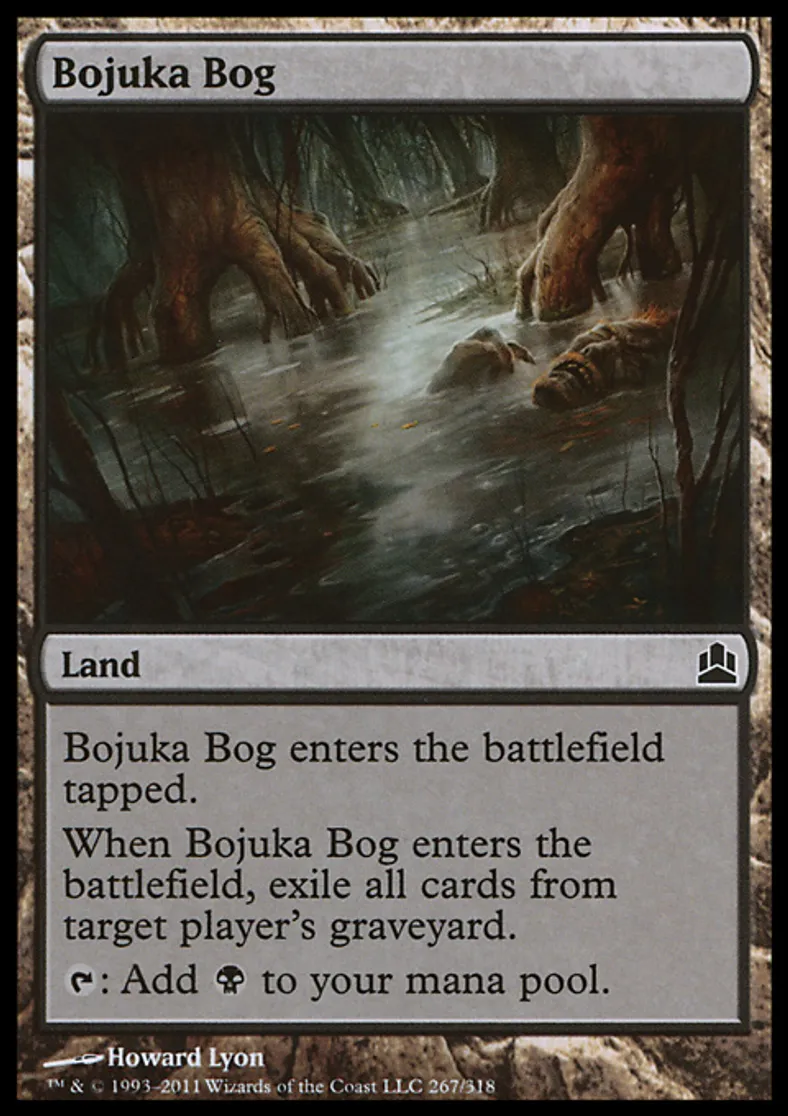 | Oracle Text | Bojuka Bog enters the battlefield tapped. When Bojuka Bog enters the battlefield, exile all cards from target player's graveyard. {{t}}: Add {{b}} to your mana pool. | ||