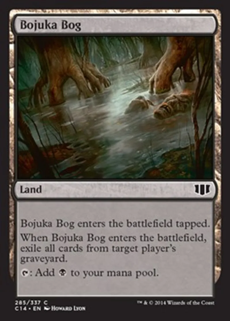 | Oracle Text | Bojuka Bog enters the battlefield tapped. When Bojuka Bog enters the battlefield, exile all cards from target player's graveyard. {{t}}: Add {{b}} to your mana pool. | ||