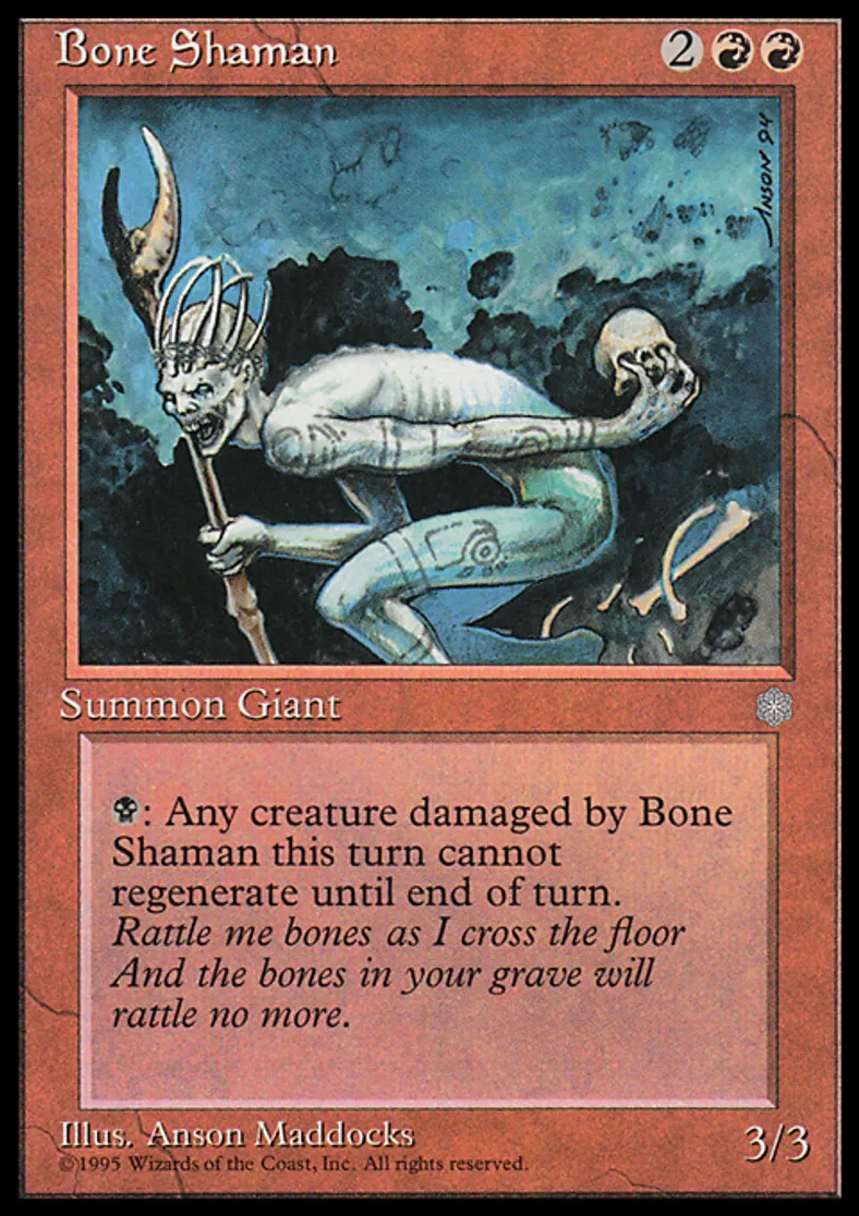 | Oracle Text | {{b}}: Until end of turn, Bone Shaman gains "Creatures dealt damage by Bone Shaman this turn can't be regenerated this turn." | ||