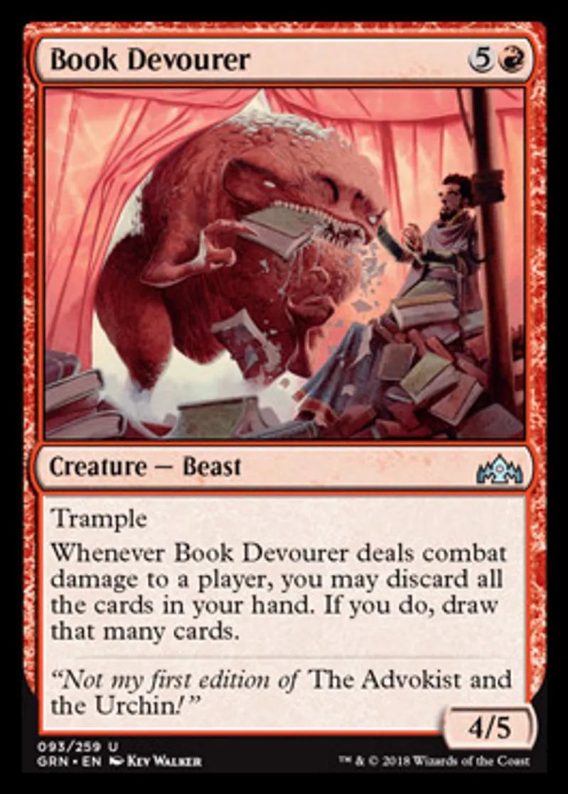 | Oracle Text | Trample Whenever Book Devourer deals combat damage to a player, you may discard all the cards in your hand. If you do, draw that many cards. | ||