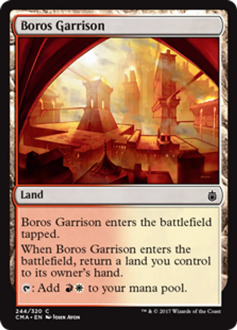 | Oracle Text | Boros Garrison enters the battlefield tapped. When Boros Garrison enters the battlefield, return a land you control to its owner's hand. {{t}}: Add {{r}}{{w}} to your mana pool. | ||