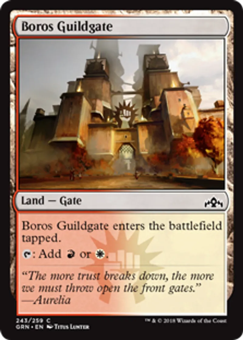 | Oracle Text | Boros Guildgate enters the battlefield tapped. {{t}}: Add {{r}} or {{w}}. | ||