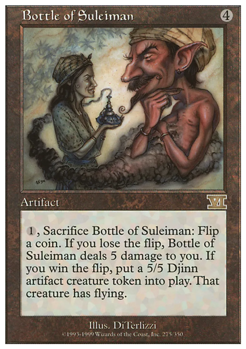 | Oracle Text | {{1}}, Sacrifice Bottle of Suleiman: Flip a coin. If you lose the flip, Bottle of Suleiman deals 5 damage to you. If you win the flip, put a 5/5 colorless Djinn artifact creature token with flying onto the battlefield. | ||