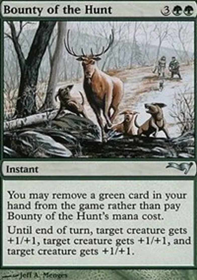 | Oracle Text | You may exile a green card from your hand rather than pay Bounty of the Hunt's mana cost. Distribute three +1/+1 counters among one, two, or three target creatures. For each +1/+1 counter you put on a creature this way, remove a +1/+1 counter from that creature at the beginning of the next cleanup step. | ||
