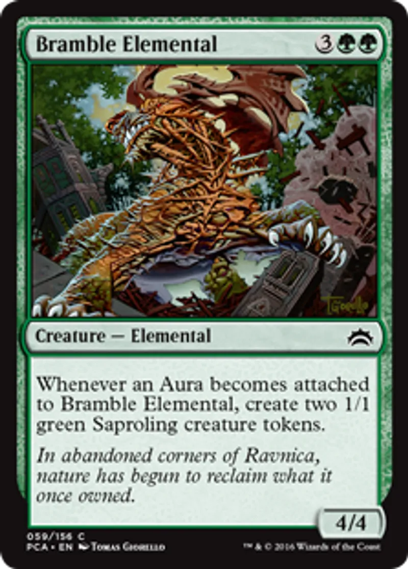 | Oracle Text | Whenever an Aura becomes attached to Bramble Elemental, create two 1/1 green Saproling creature tokens. | ||