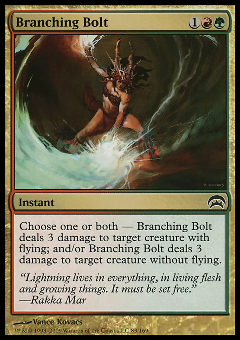 | Oracle Text | Choose one or both — Branching Bolt deals 3 damage to target creature with flying; and/or Branching Bolt deals 3 damage to target creature without flying. | ||