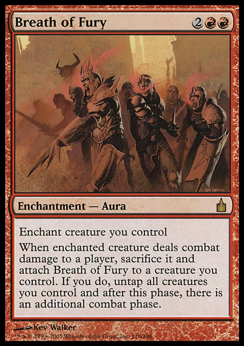 | Oracle Text | Enchant creature you control When enchanted creature deals combat damage to a player, sacrifice it and attach Breath of Fury to a creature you control. If you do, untap all creatures you control and after this phase, there is an additional combat phase. | ||
