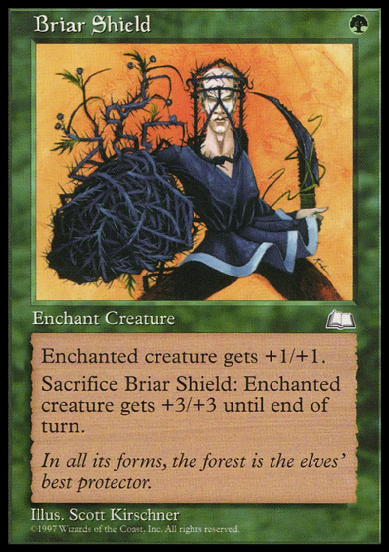 | Oracle Text | Enchant creature Enchanted creature gets +1/+1. Sacrifice Briar Shield: Enchanted creature gets +3/+3 until end of turn. | ||