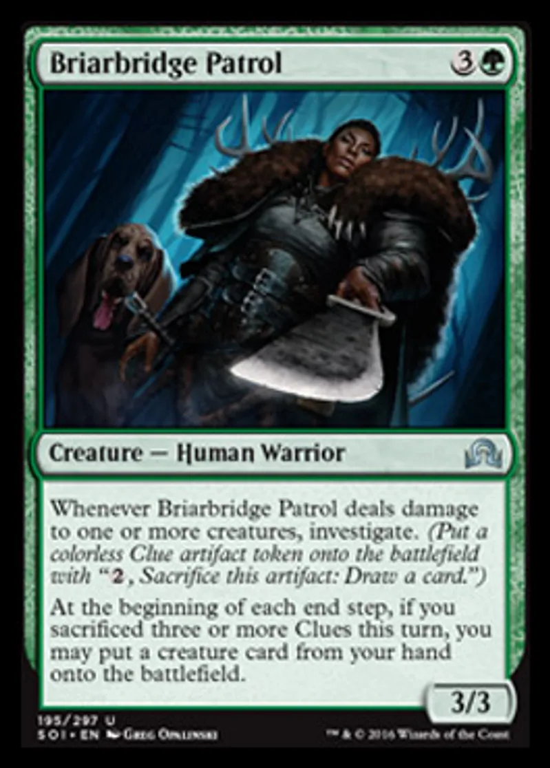 | Oracle Text | Whenever Briarbridge Patrol deals damage to one or more creatures, investigate. (Put a colorless Clue artifact token onto the battlefield with "{{2}}, Sacrifice this artifact: Draw a card.") At the beginning of each end step, if you sacrificed three or more Clues this turn, you may put a creature card from your hand onto the battlefield. | ||