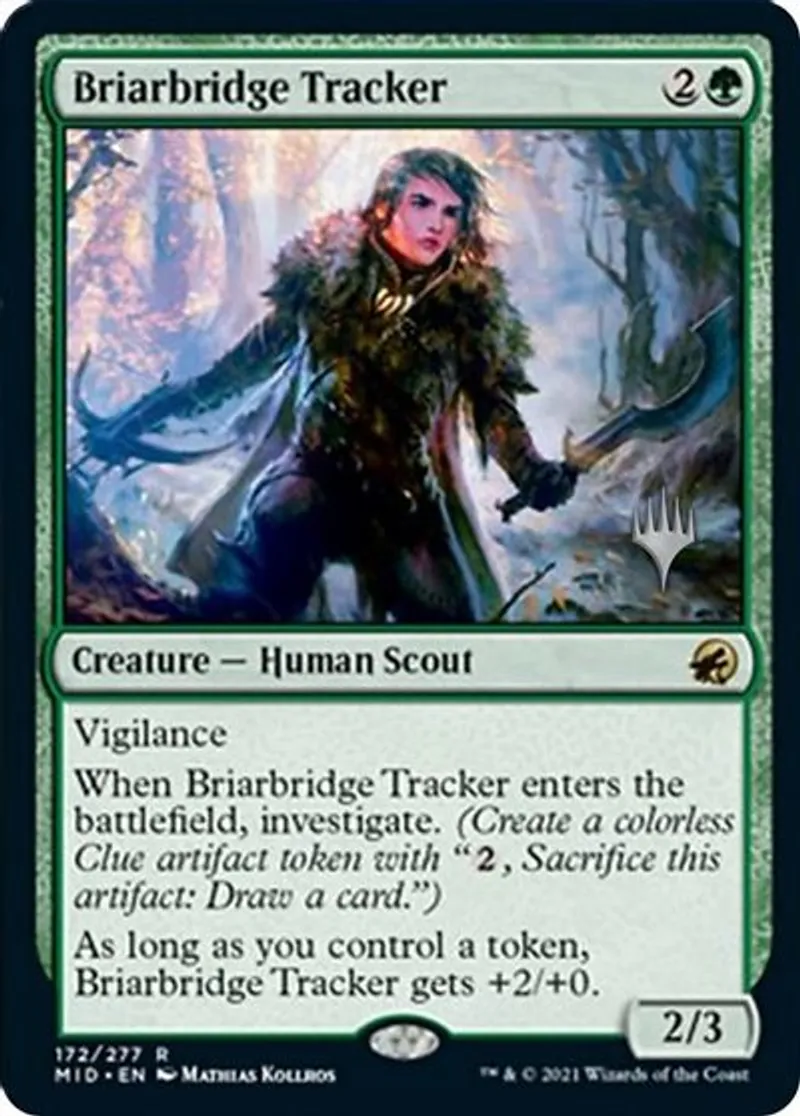 When Briarbridge Tracker enters the battlefield, investigate. (Create a colorless Clue artifact token with “{{2}}, Sacrifice this artifact: Draw a card.”)