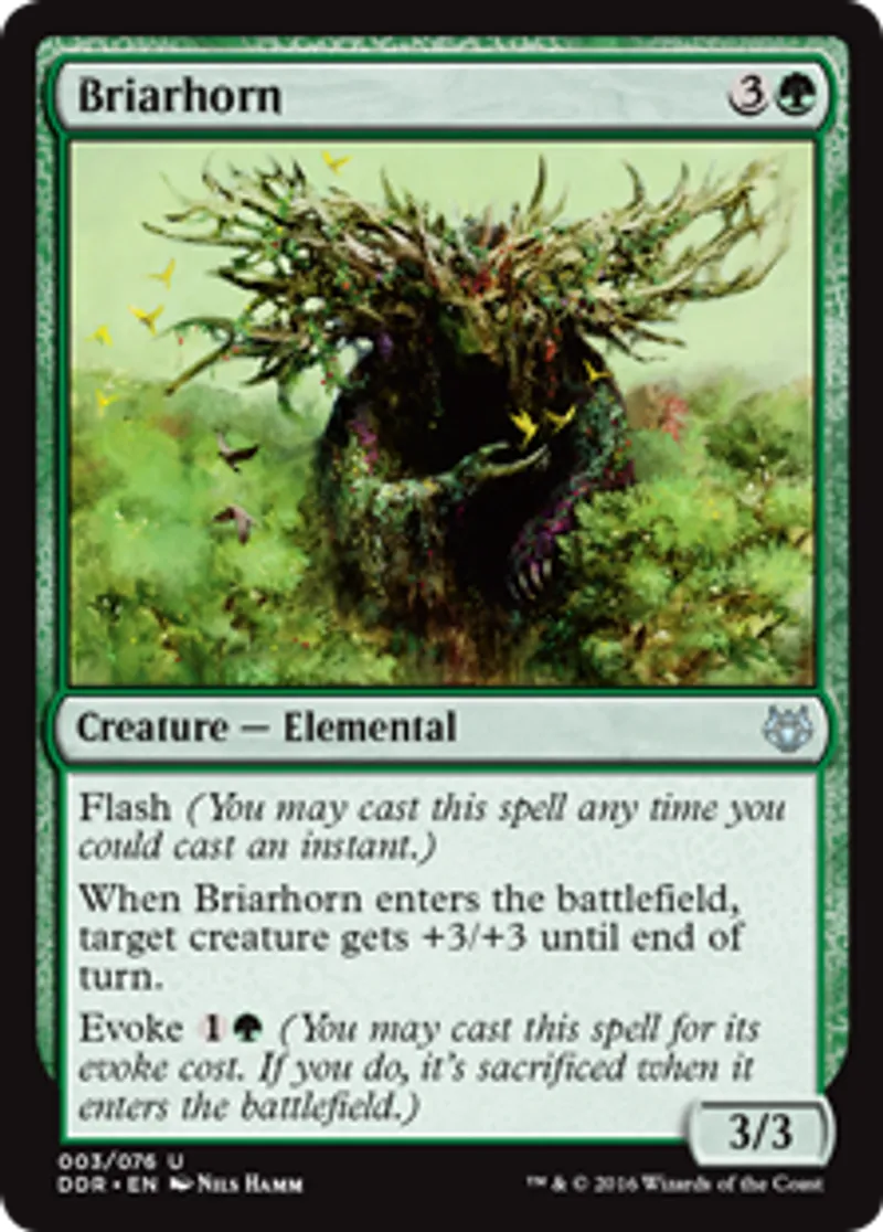 | Oracle Text | Flash When Briarhorn enters the battlefield, target creature gets +3/+3 until end of turn. Evoke {{1}}{{g}} (You may cast this spell for its evoke cost. If you do, it's sacrificed when it enters the battlefield.) | ||