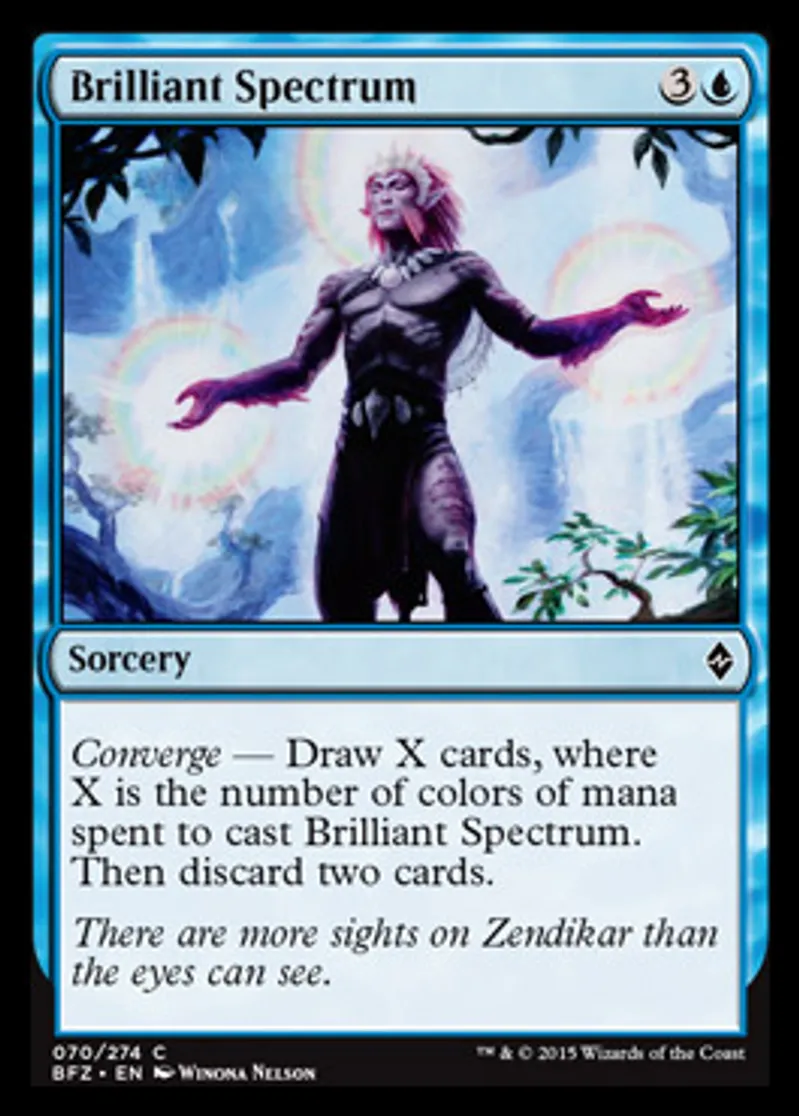 | Oracle Text | Converge — Draw X cards, where X is the number of colors of mana spent to cast Brilliant Spectrum. Then discard two cards. | ||