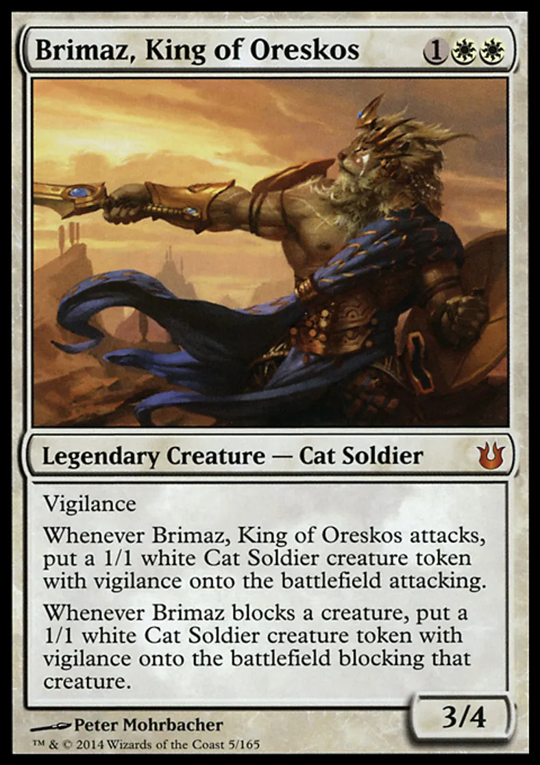 | Oracle Text | Vigilance Whenever Brimaz, King of Oreskos attacks, put a 1/1 white Cat Soldier creature token with vigilance onto the battlefield attacking. Whenever Brimaz blocks a creature, put a 1/1 white Cat Soldier creature token with vigilance onto the battlefield blocking that creature. | ||