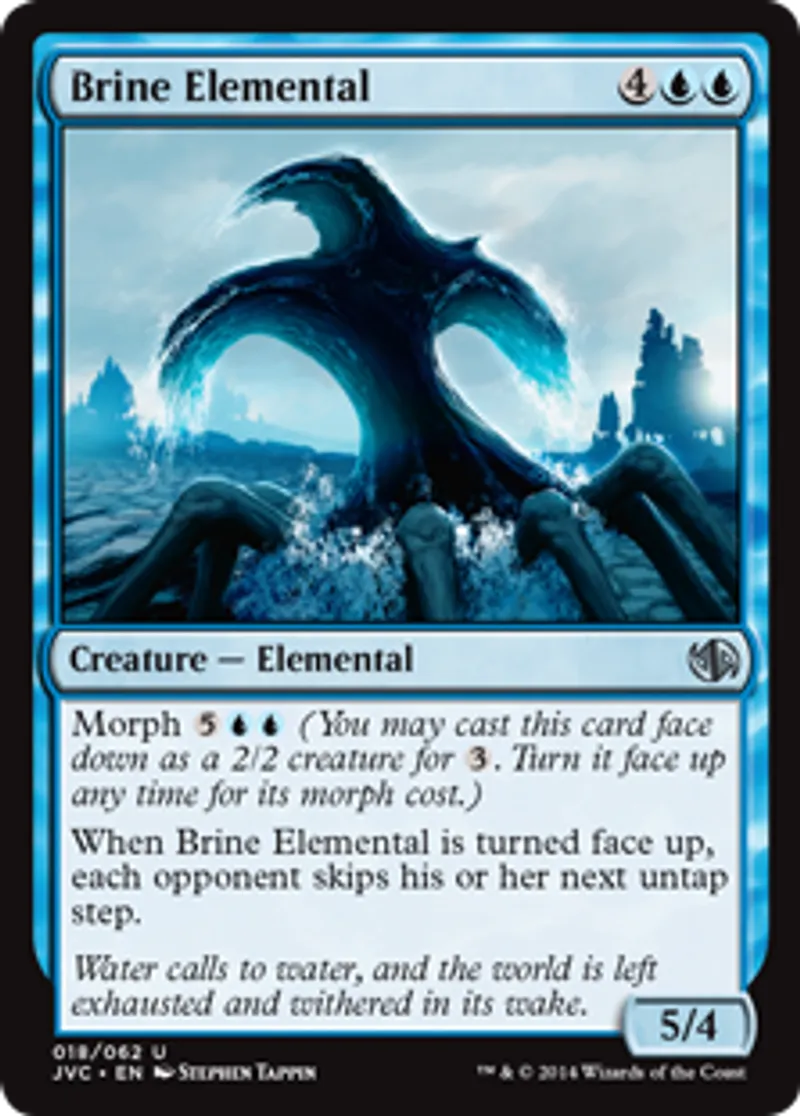 | Oracle Text | Morph {{5}}{{u}}{{u}} (You may cast this card face down as a 2/2 creature for {{3}}. Turn it face up any time for its morph cost.) When Brine Elemental is turned face up, each opponent skips his or her next untap step. | ||
