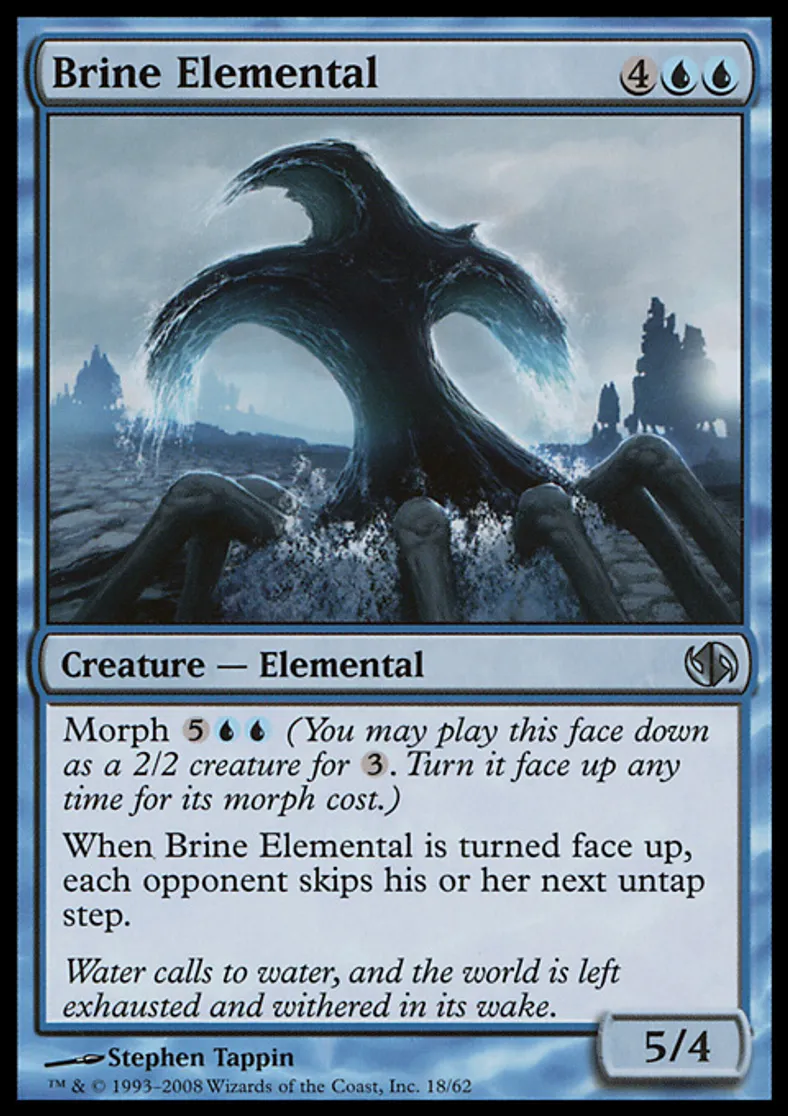 | Oracle Text | Morph {{5}}{{u}}{{u}} (You may cast this face down as a 2/2 creature for {{3}}. Turn it face up any time for its morph cost.) When Brine Elemental is turned face up, each opponent skips his or her next untap step. | ||
