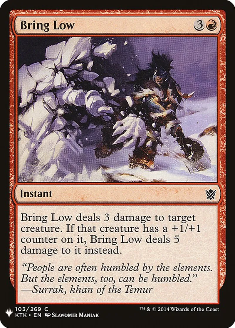 | Oracle Text | Bring Low deals 3 damage to target creature. If that creature has a +1/+1 counter on it, Bring Low deals 5 damage to it instead. | ||