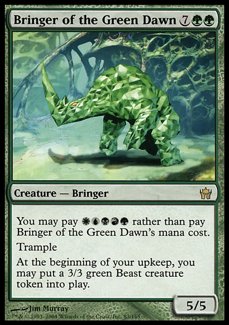 | Oracle Text | You may pay {{w}}{{u}}{{b}}{{r}}{{g}} rather than pay Bringer of the Green Dawn's mana cost. Trample At the beginning of your upkeep, you may put a 3/3 green Beast creature token onto the battlefield. | ||