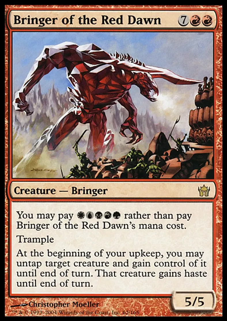 | Oracle Text | You may pay {{w}}{{u}}{{b}}{{r}}{{g}} rather than pay Bringer of the Red Dawn's mana cost. Trample At the beginning of your upkeep, you may untap target creature and gain control of it until end of turn. That creature gains haste until end of turn. | ||