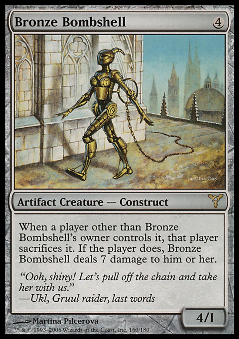 | Oracle Text | When a player other than Bronze Bombshell's owner controls it, that player sacrifices it. If the player does, Bronze Bombshell deals 7 damage to him or her. | ||