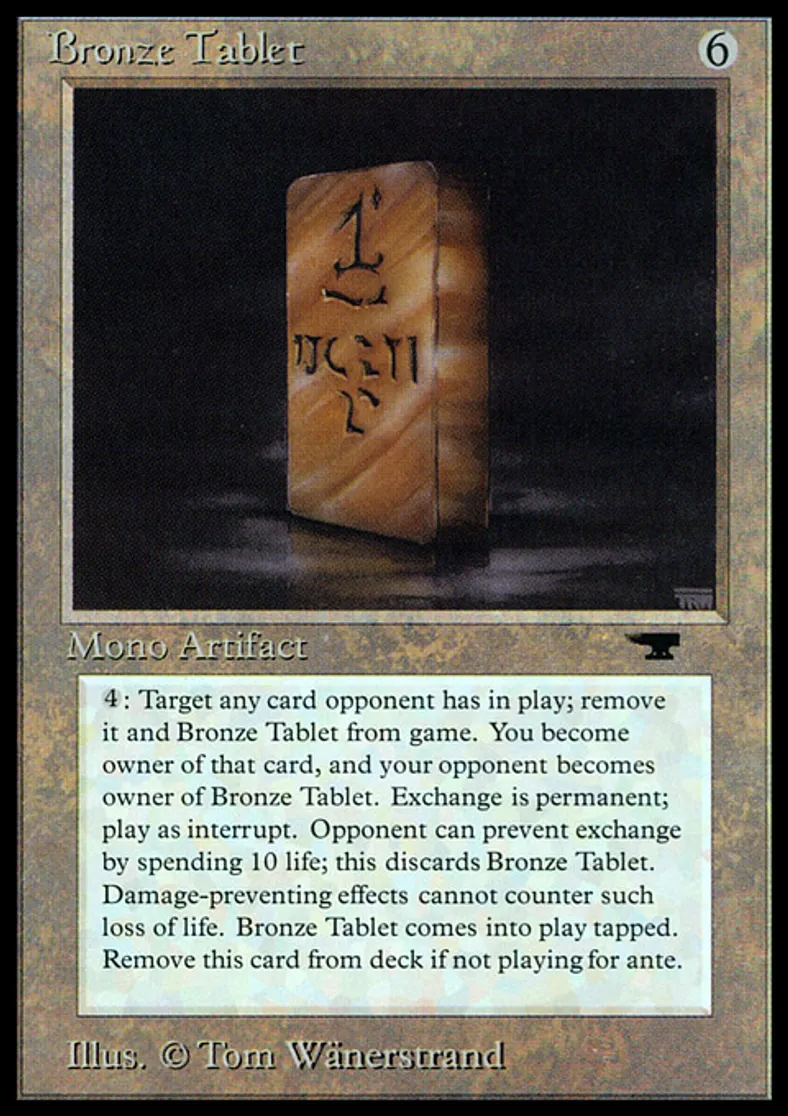 | Oracle Text | Remove Bronze Tablet from your deck before playing if you're not playing for ante. Bronze Tablet enters the battlefield tapped. {{4}}, {{t}}: Exile Bronze Tablet and target nontoken permanent an opponent owns. That player may pay 10 life. If he or she does, put Bronze Tablet into its owner's graveyard. Otherwise, that player owns Bronze Tablet and you own the other exiled card. | ||