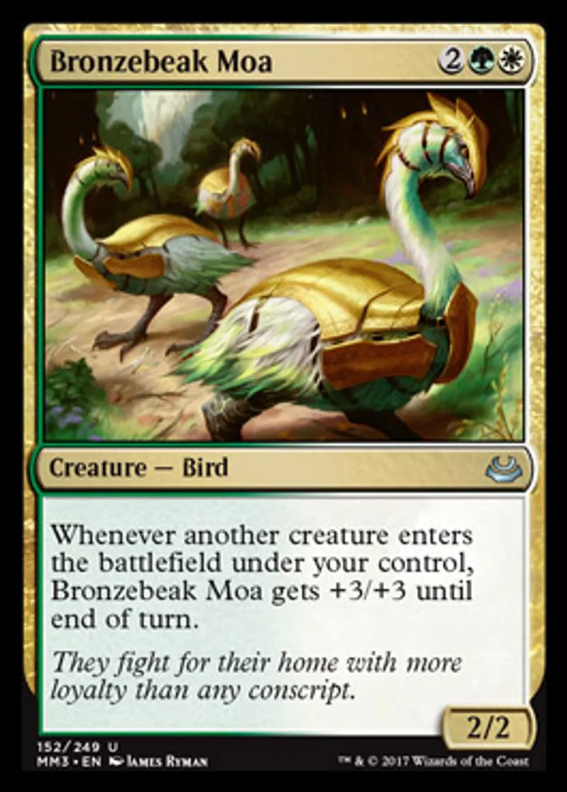 | Oracle Text | Whenever another creature enters the battlefield under your control, Bronzebeak Moa gets +3/+3 until end of turn. | ||
