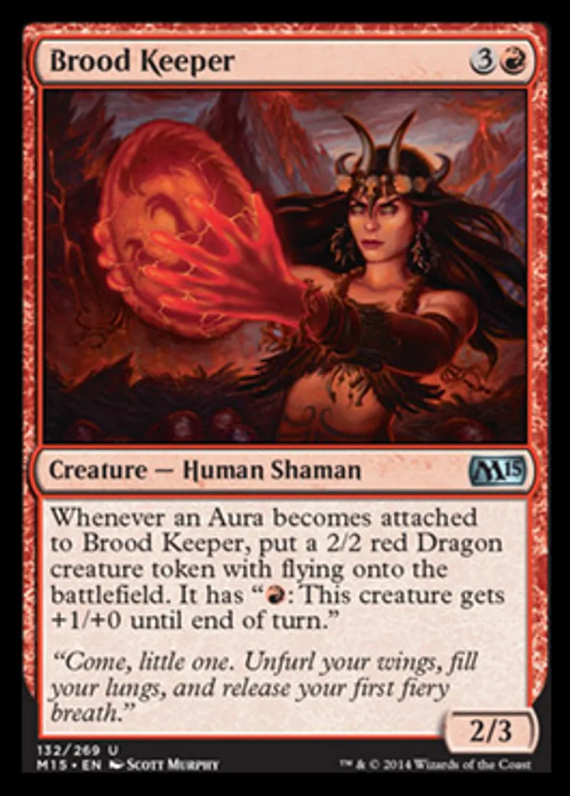 | Oracle Text | Whenever an Aura becomes attached to Brood Keeper, put a 2/2 red Dragon creature token with flying onto the battlefield. It has "{{r}}: This creature gets +1/+0 until end of turn." | ||