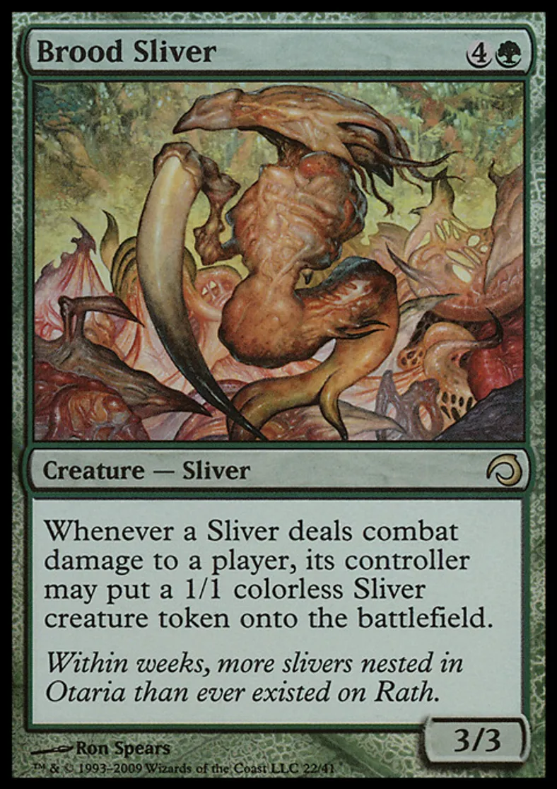 | Oracle Text | Whenever a Sliver deals combat damage to a player, its controller may put a 1/1 colorless Sliver creature token onto the battlefield. | ||