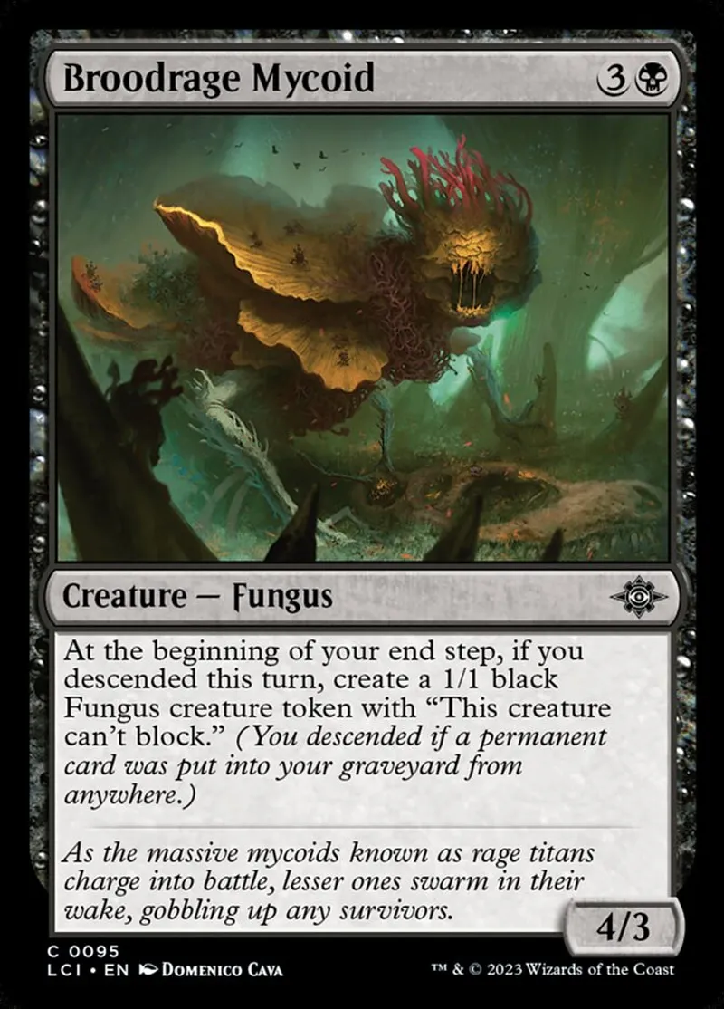 | Oracle Text | At the beginning of your end step, if you descended this turn, create a 1/1 black Fungus creature token with "This creature can't block." (You descended if a permanent card was put into your graveyard from anywhere.) | ||